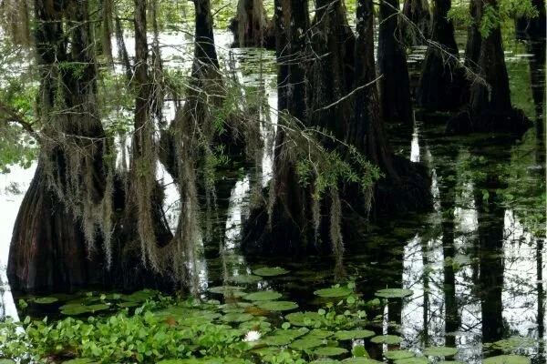 View of Lake Miccosukee cypress trees with moss and beautiful water lilys